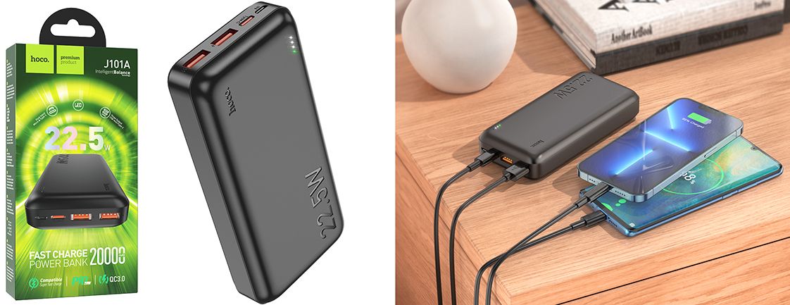 Power Bank Hoco J101A Astute — універсальний зовнішній акумулятор, який допоможе швидко зарядити більшість моделей сучасних гаджетів. Портативна батарея має невеликі розміри та вагу, реалізована в практичному дизайні із заокругленими ребрами та приємною на дотик поверхнею. Якісно зібраний корпус пристрою виготовлений з ударостійкого ABS-пластику та вогнестійкого полікарбонату. На його лицьовій панелі знаходяться LED-індикатори, які активуються за допомогою кнопки, що розташована на бічній грані, і допоможуть контролювати рівень заряду вбудованої літій-полімерної батареї ємністю 20000mAh.